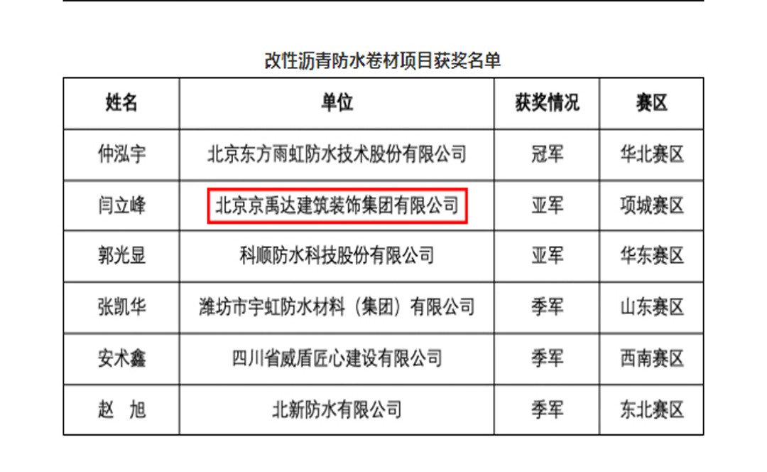 11月6日,2021年全國建筑防水行業(yè)職業(yè)技能大賽決賽圓滿落幕。作為出賽的京禹達(dá)集團(tuán),表現(xiàn)出色,榮獲2021年防水行業(yè)職業(yè)技能大賽改性瀝青防水卷材項(xiàng)目組亞軍的優(yōu)異成績。